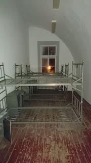 W którymś z kolejnych pokoi ujrzeliśmy poustawiane metalowe prycze. Moja wyobraźnia natychmiast podsunęła widok szarych koców i nocne skrzypienie sprężyn uginających się pod ciężarem spoczywających na nich ciał.